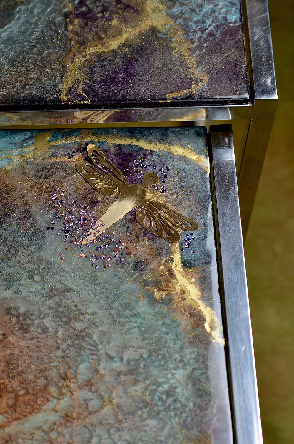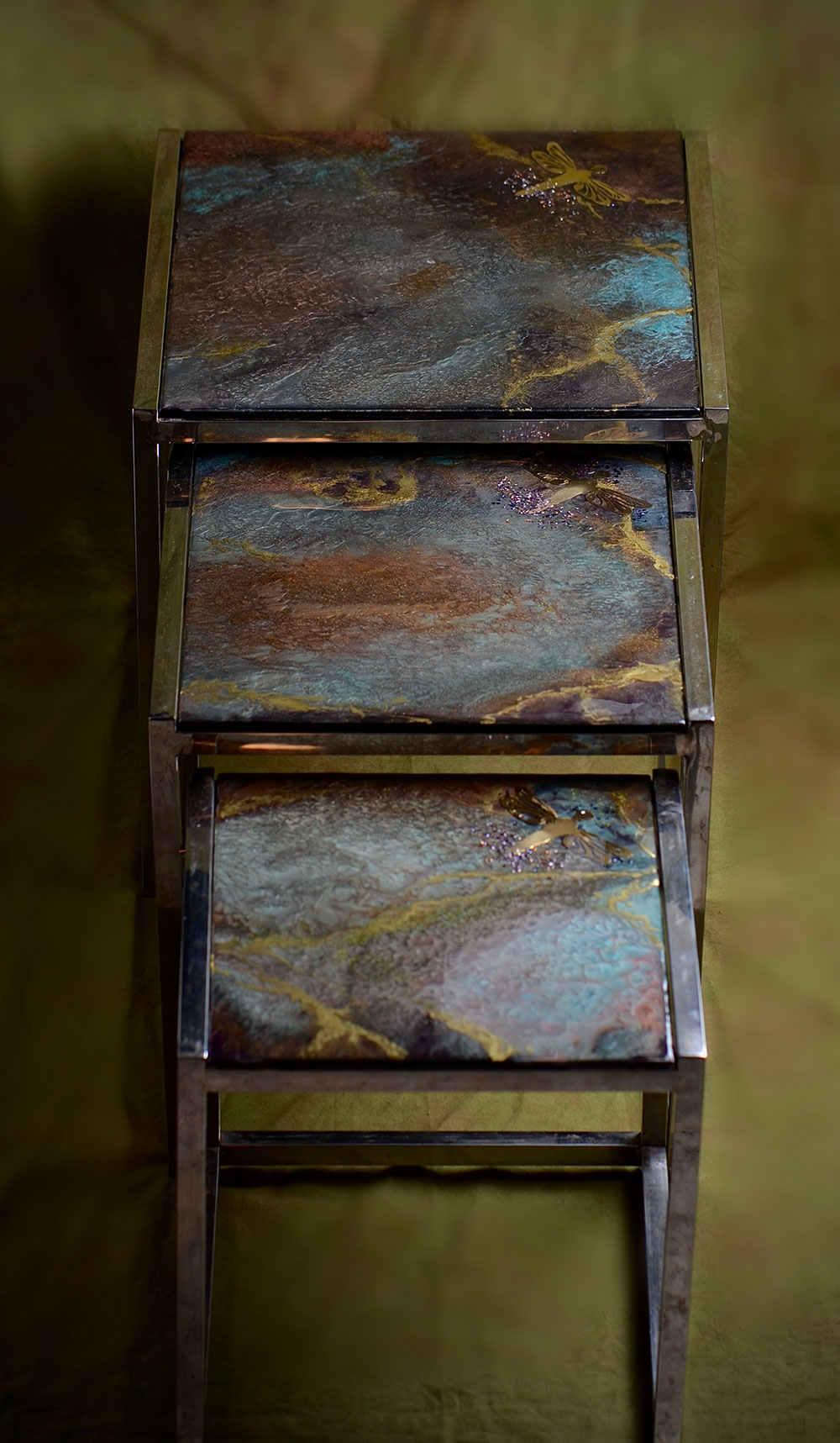 Varied elements embedded in waterproof, scratch-resistant, heat protected resin block mounted on nesting table frames [24” with crystals/ 18” with florals/ 16” with pearls and gold foil]