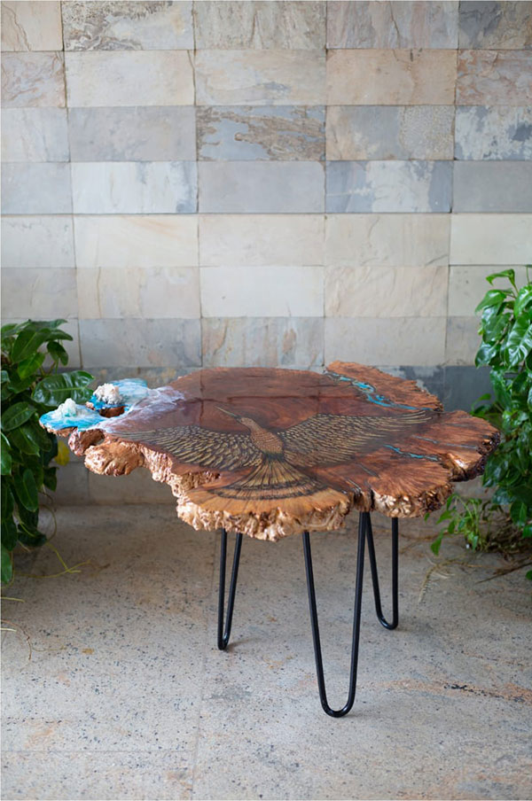Live-edge wood table composed of dehydrated and treated Red Indian tree bark, hand-sketched, with a resin topcoat [tabletop size: approx. 28”-30”]
