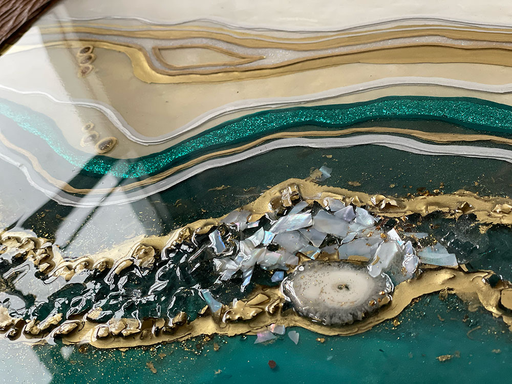 Large wooden door with a low-key resin inlay shaped to complement the natural lines and swirls of the wood grain. Defined by its translucency, the resin inlay “glows” in the presence of light, showcasing the inset shells and stones. [8’ x4’]