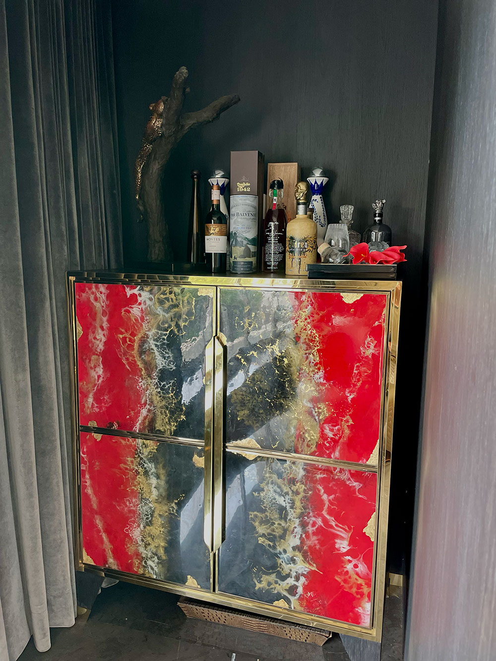 Trimmed in a gold metal frame with gold handles, this resin bar cabinet incorporates a unique and natural honeycomb and gold leaf design that provides a pop of color but remains a classy and exclusive addition to any social space. [4’ x 4’]