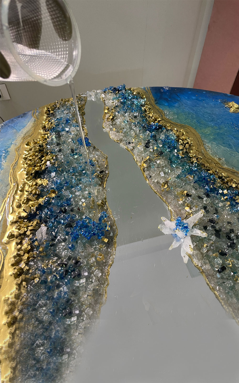 The unique features of resin allow it to be used in multiple ways and alongside various other materials. There is no limit to what resin can do and what it can become. To harness the power and versatility of resin, Poonam experiments with different tools and techniques to create products that will last and continue to add elegance and joy to your space.