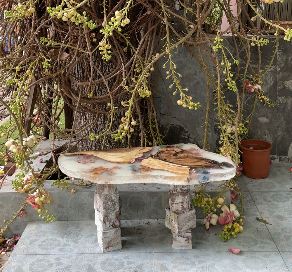 Garden table/bench with wood and dehydrated florals mounted on concrete blocks [resin block size: 30”]