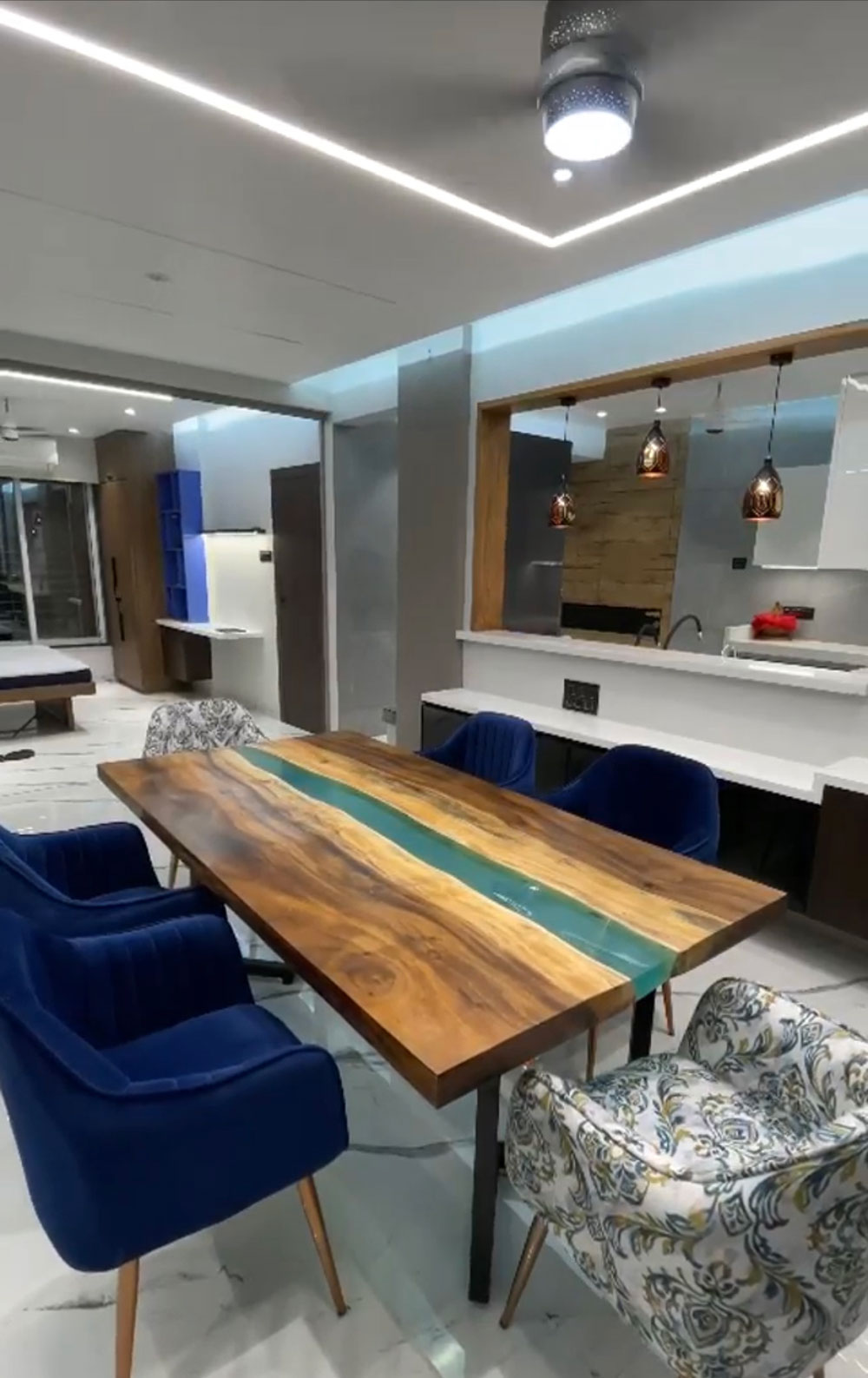 8-seater table, converted and extended from a 6-seater using transparent river table technique, glamourized with a geode center and peripheral lighting