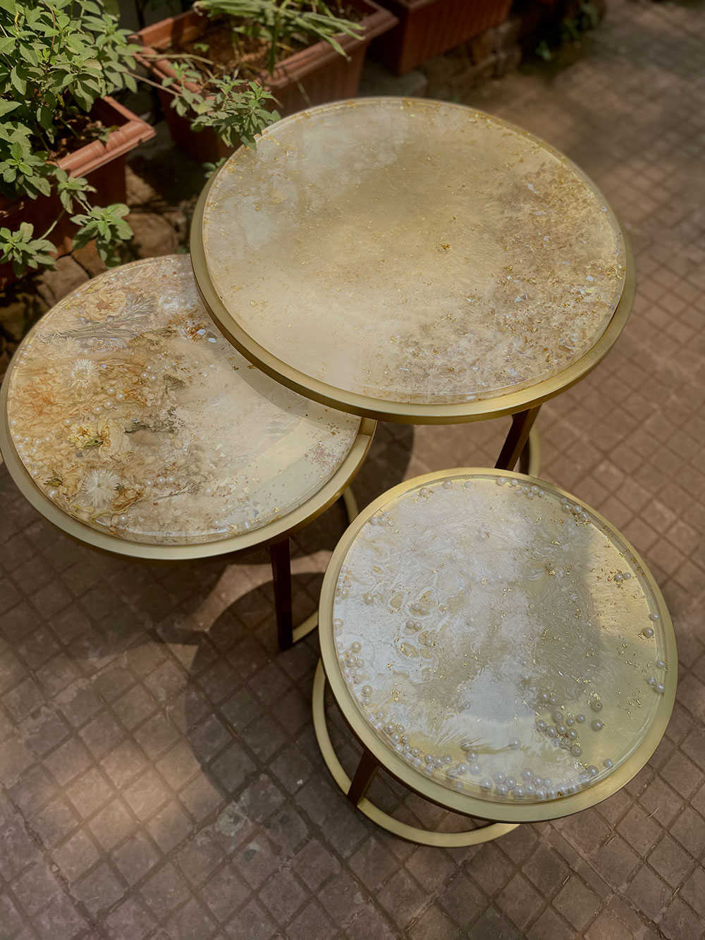 Varied elements embedded in waterproof, scratch-resistant, heat protected resin block mounted on nesting table frames [24” with crystals/ 18” with florals/ 16” with pearls and gold foil]