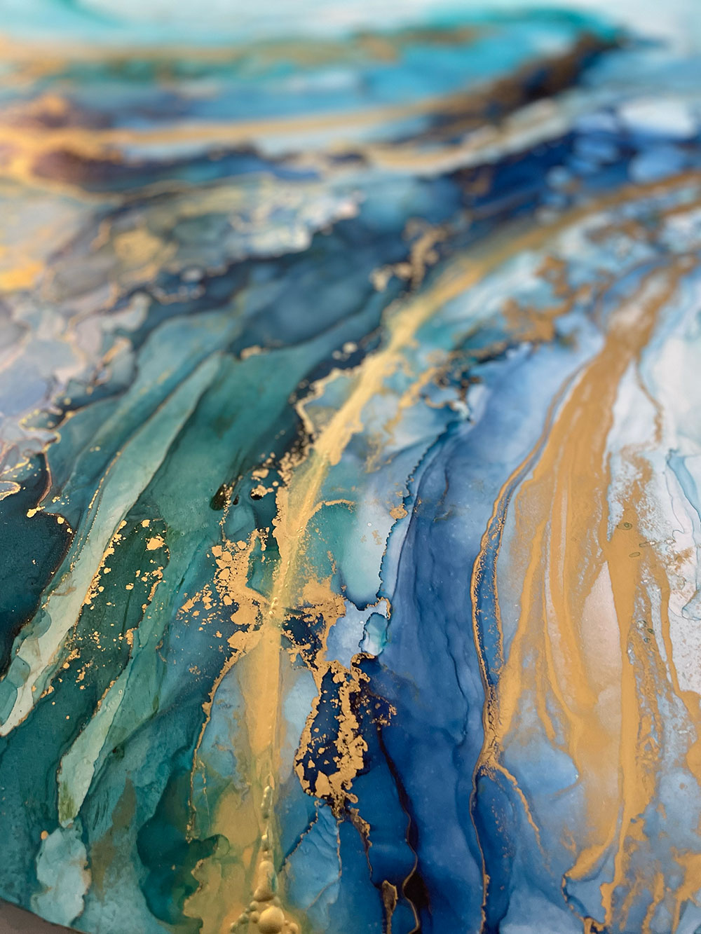 Hand-poured, diluted alcohol ink with gold leaf and texture details