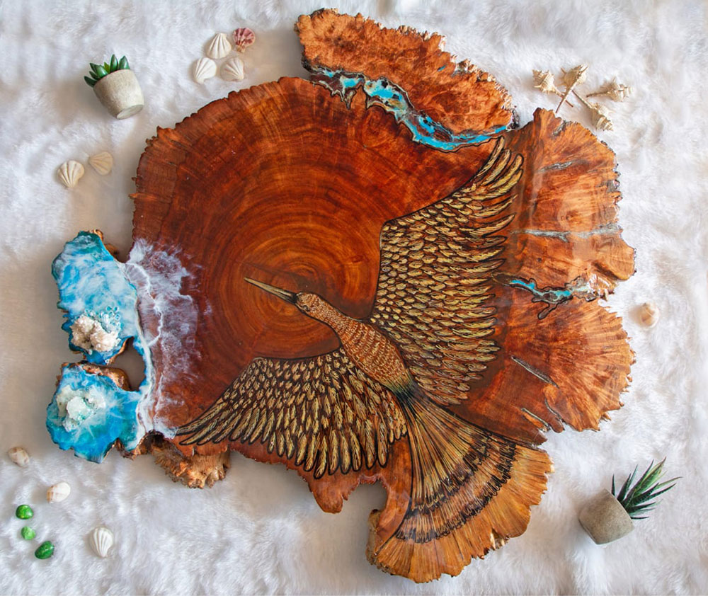 Live-edge wood table composed of dehydrated and treated Red Indian tree bark, hand-sketched, with a resin topcoat [tabletop size: approx. 28”-30”]