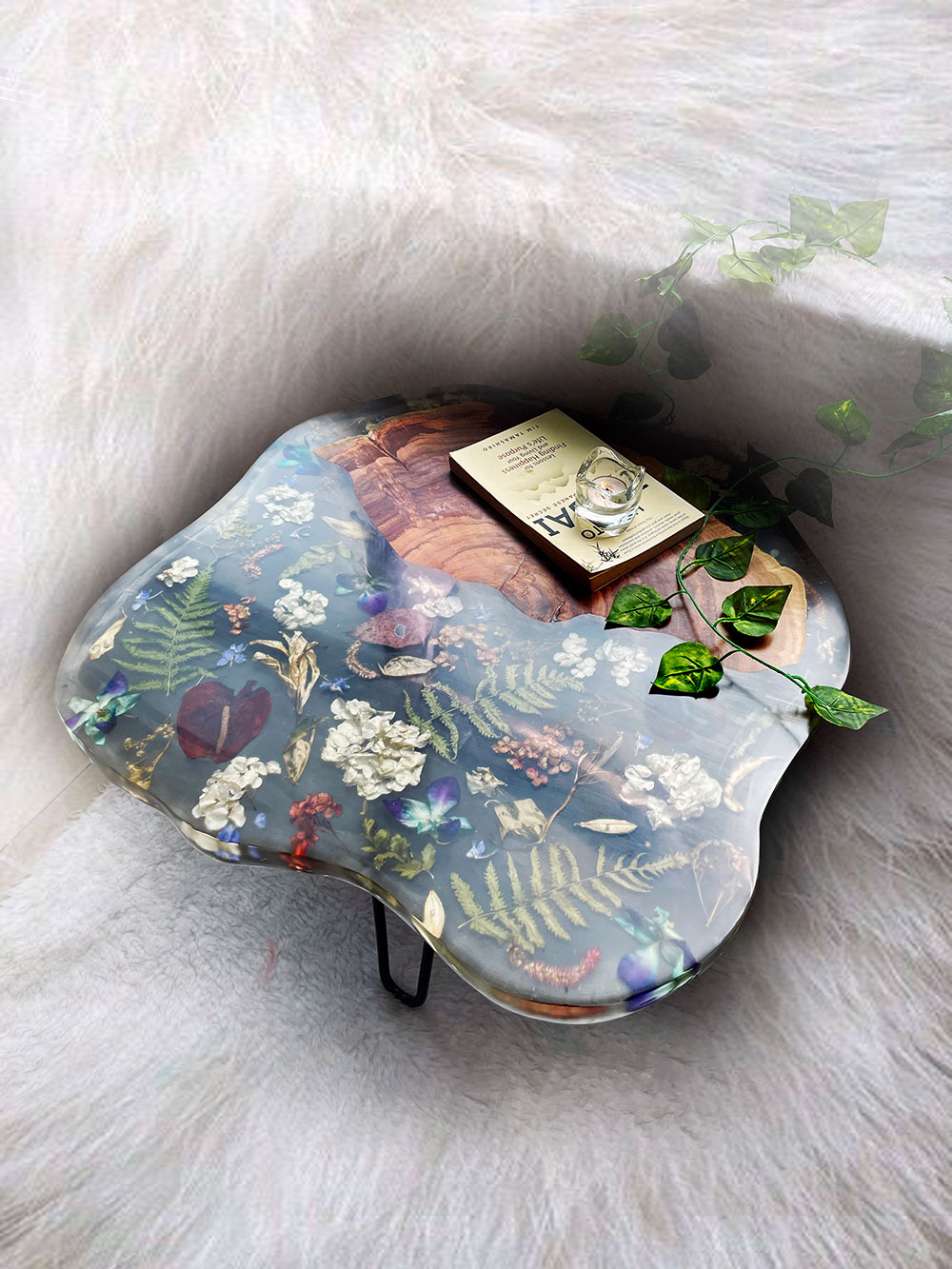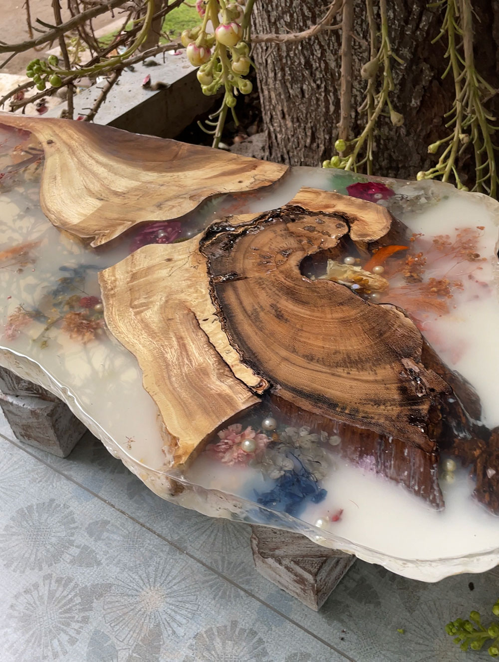Table with wood and dehydrated flowers preserved in resin to retain shape and color [tabletop size: approx. 18”]