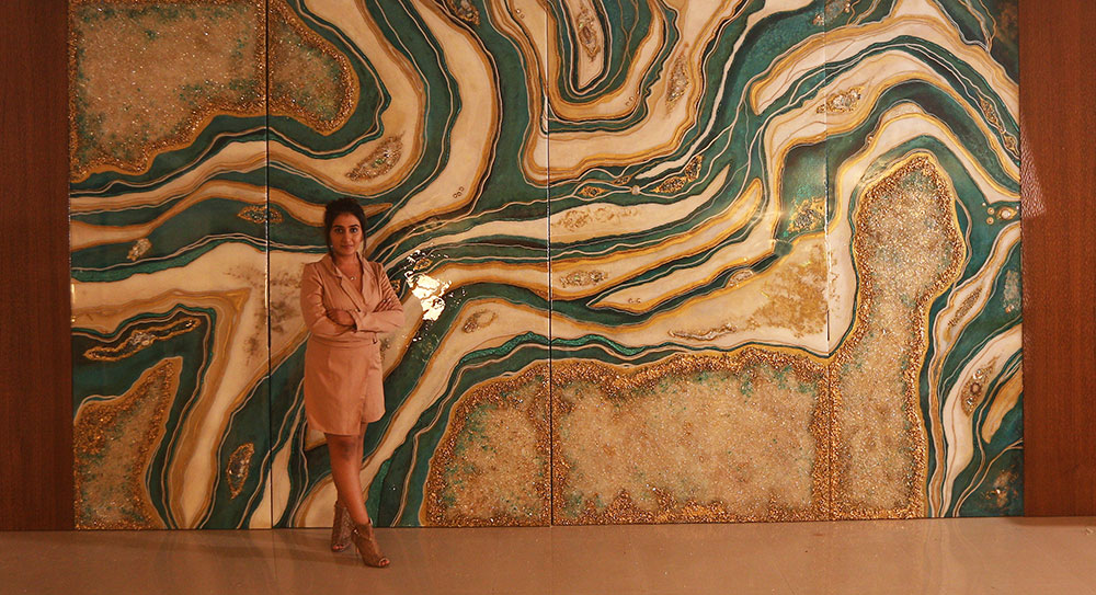 One of our largest installations, this 4-panel wardrobe adds drama to the room with its floor-to-ceiling seamless and continuous design. This replica of an agate incorporates geode elements with real Swarovski crystals. In addition to its massive size and bold design, a highlighting feature of this piece is the camouflaged handles, which don’t detract your attention from the splendor and look of the overall wardrobe. [16’ x 8’]