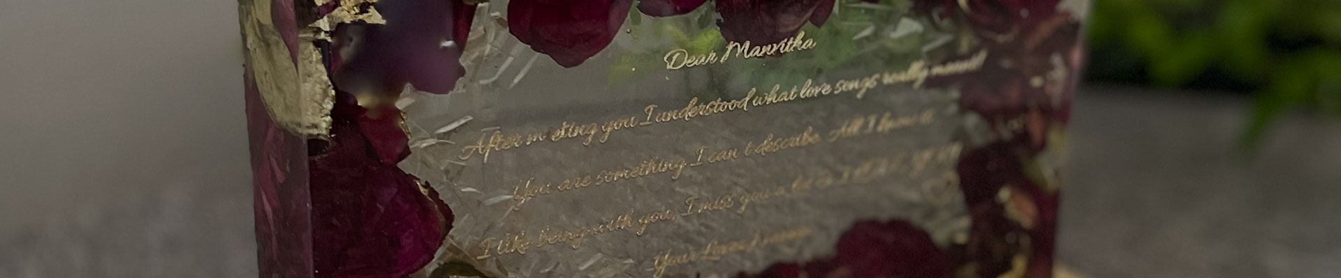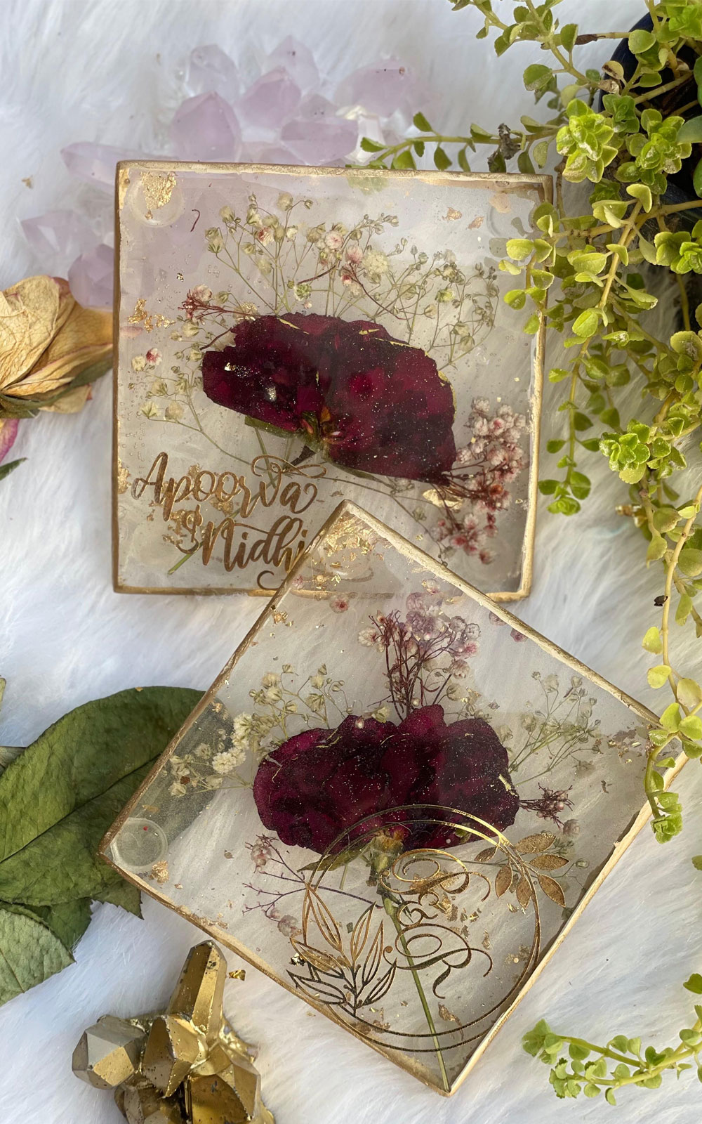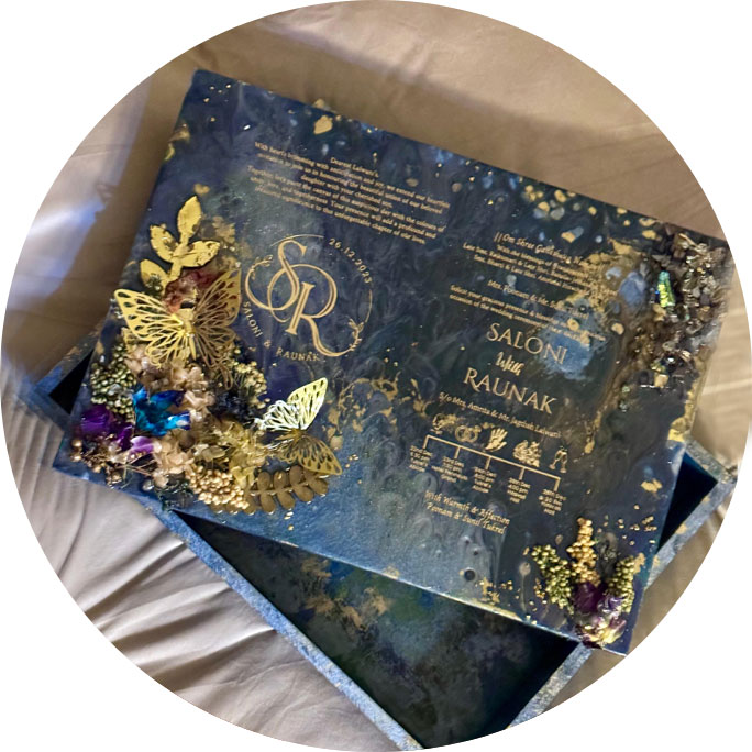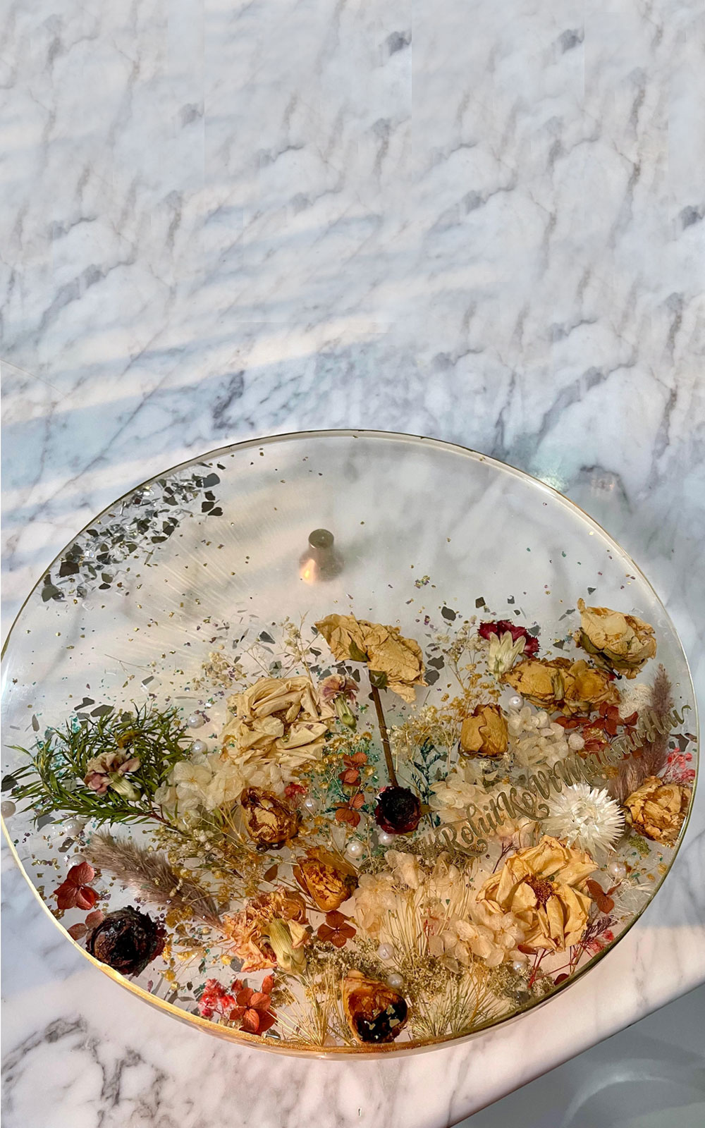 Let us help you encase your memories in the magnificent medium of resin. From personalized wedding invitation boxes to engagement trays to embedding your floral memories from your special occasion in an everlasting, bespoke piece, we can do it all.